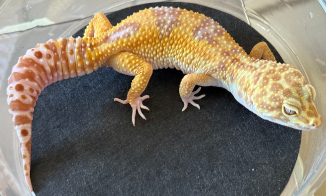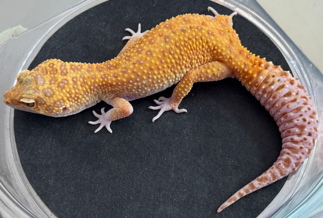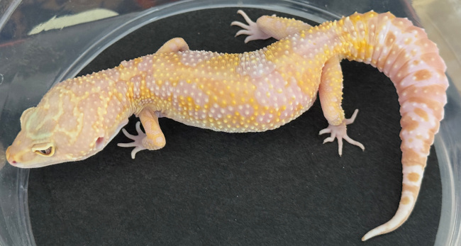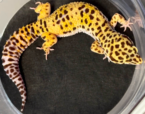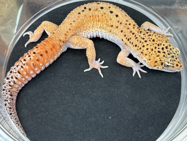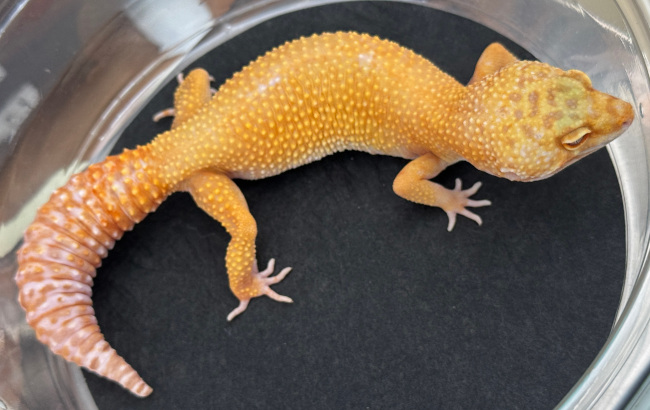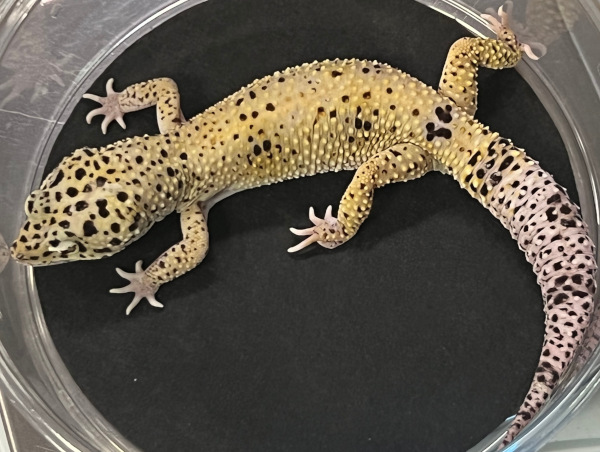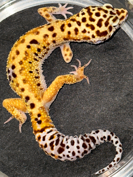 Males are 100 grams or more, with some having reached over 175 grams at the time of this writing. Females are 90 grams or more. Super Giant x Super Giant = 100% Super Giants. Offspring from a Super Giant x Normal breeding would be het for Super Giant. With line-breeding efforts the first 200-gram leopard gecko will likely occur in a few years.