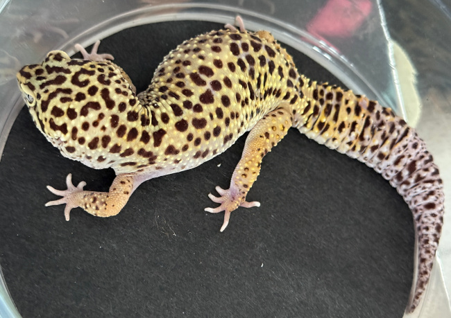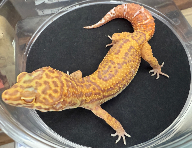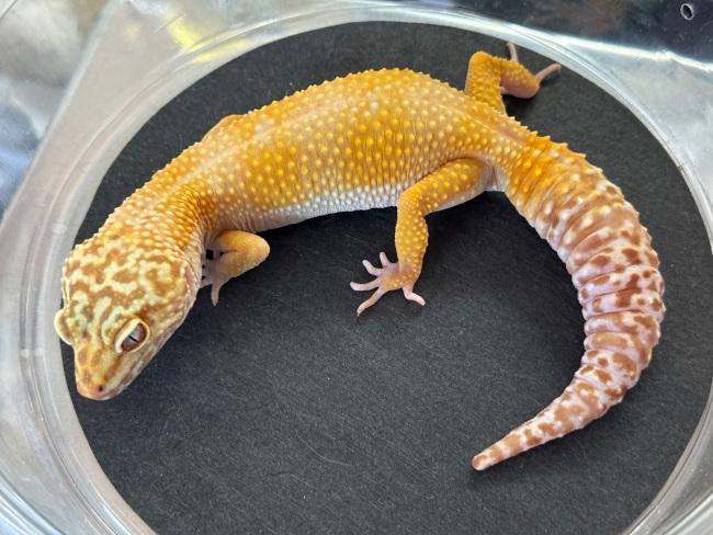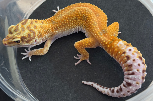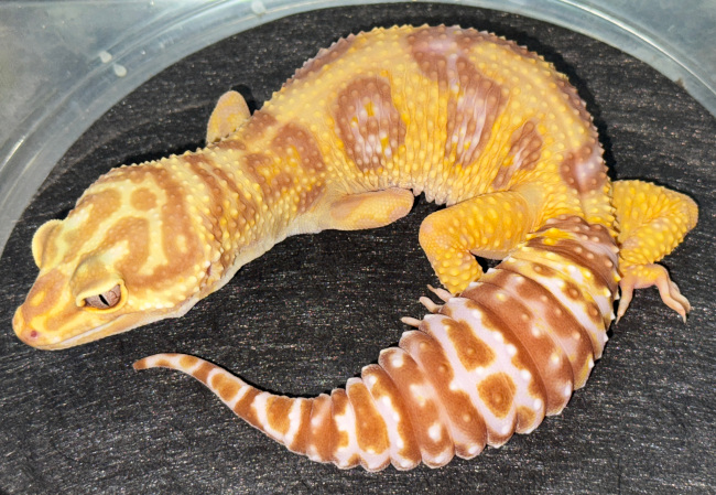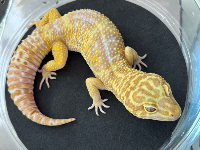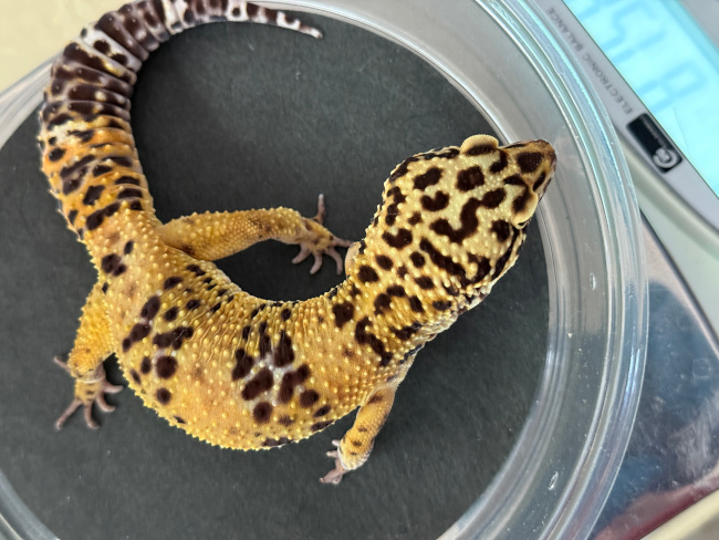 Males are 100 grams or more, with some having reached over 175 grams at the time of this writing. Females are 90 grams or more. Super Giant x Super Giant = 100% Super Giants. Offspring from a Super Giant x Normal breeding would be het for Super Giant. With line-breeding efforts the first 200-gram leopard gecko will likely occur in a few years.